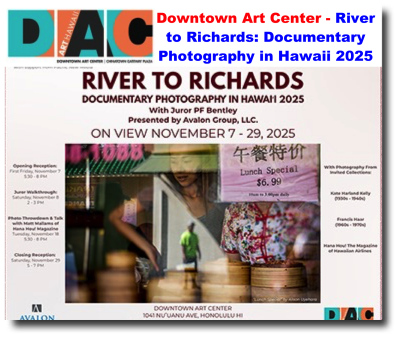 This exhibition by Hawaii Watercolor Society features 62 gorgeous paintings in water media by 51 local artists, selected by juror Gary Tucker. - 11/7/2025 - Downtown Art Center Presents - River to Richards: Documentary Photography in Hawaii 2025 - 5:30 to 8 p.m