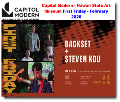 Newsletter goes out via Email the day before each First Friday. Join the Email List. Special offers, art news, Downtown/Chinatown news and more. - 2/6/2026 - Capitol Modern - Hawaii State Art Museum First Friday - FEBRUARY 2026 - NEW EXHIBITS! - 5:00pm - 9:00pm