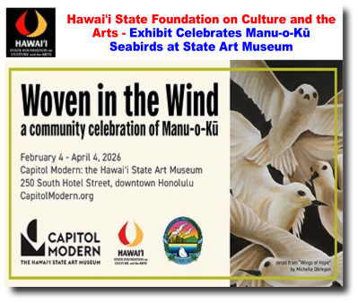 The Hawaiʻi State Foundation on Culture and the Arts (SFCA) announces a new exhibit at Capitol Modern: the Hawaiʻi State Art Museum. The “Woven in the Wind”, a collaboration with Hui Manu-O-Kū, is open through April 4, 2026. - First Friday Hawaii Art Gallery Walk Newsletter February 2026