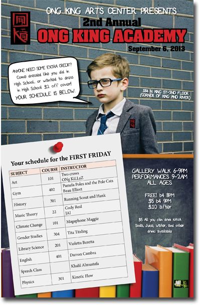 Nerds, bullies, wallflowers, bandies, techies, prom queens, emos, goths, self proclaimed artists, rebels, cheerleaders, outcasts, jocks, mathletes, Mr. Popular, teachers pet, freaks, geeks and anyone else who survived high school UNITE!!! It is time to relive High school the way it should have been! FUN! Ong King Academies second semester will be in FULL swing this coming First Friday September 6th and your attendance is mandatory. Come make some year book memories this First Friday with your favorite neighborhood art center!!!. $2 dollars off cover if you come dressed accordingly.