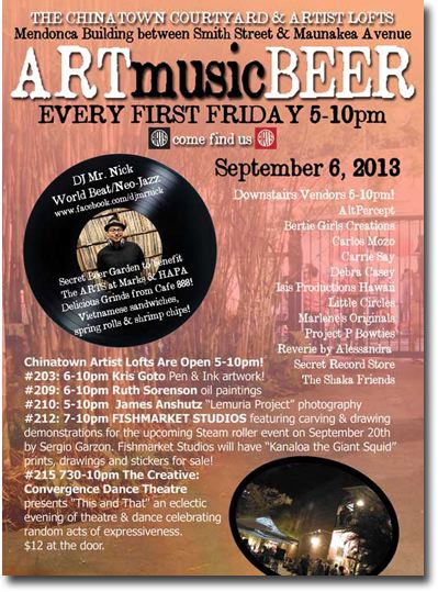 The Chinatown Courtyard will be transformed into a Secret Beer Garden benefiting The ARTS at Marks. (www.artsatmarks.com). Shop Bop & Grind takes over the downstairs walkway with music by DJ Mr. Nick that'll make you bop while you shop, delicious grinds by CafŽ 888 - 1123 Maunakea Street (Vietnamese sandwiches, spring rolls, & shrimp chips) and local goods (www.shopbopgrind.posterous.com).