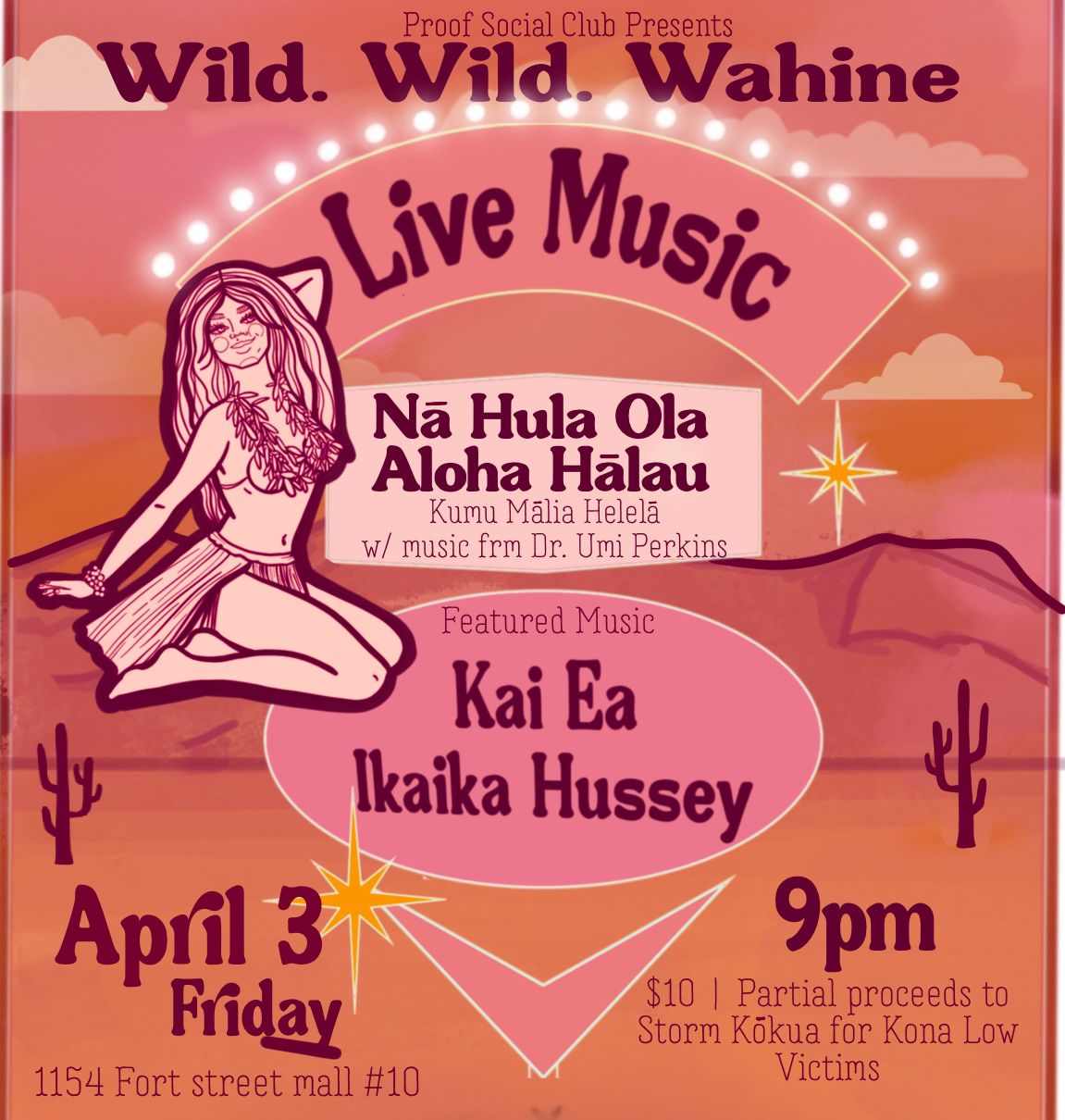 Proof Social Club presents Wild, Wild Wahine - a First Friday event with kanaka wahine artists, hula and live music. Featuring works by Napua Camarillo, Kalani and Kumu Malia Helela. Performances by Na Hula Ola Aloha Halau, Kai Ea and Ikaika Hussey.