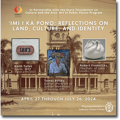 Twenty-one artworks from the SFCA Art in Public Places Collection are on display in this exhibit, curated by Brieanah Gouveia, curator for the Judiciary History Center (Aliʻiolani Hale). This exhibit explores the layered relationships between justice and power in Hawaiʻi, where diverse traditions coexist among a complex civic history. More...