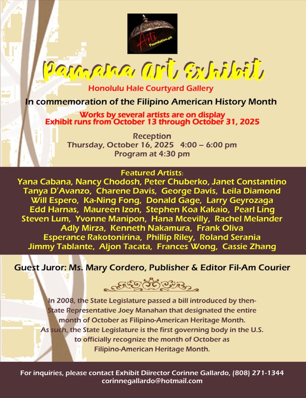The 9th Pamana Art Exhibit will be held at Honolulu Hale in October 2025. The Pamana Art Exhibit is part of a month long of activities celebrating Filipino American heritage month in the State of Hawaii. It will be a non-themed juried show; guest juror will be announced at a later date. As with past exhibits, there will be cash awards for winners. Attached is the prospectus. We hope you will consider participating this year and please share it with others who might want to. Let me know if you have any questions.