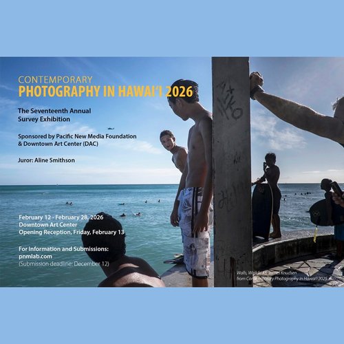 Call to Artists: Contemporary Photography in Hawai‘i 2026 Submission Deadline: December 12, 2025 On View: February 12 - 28, 2026 Photography submissions are open NOW for Pacific New Media’s “Contemporary Photography in Hawaii 2026.” This juried exhibition is open to all photographers living in Hawai‘i and requires that individual images be original, created within the past three years, and not previously publicly exhibited in Hawai‘i (except on your own website or social media); that portfolio submissions consist of original work created within the past five years, centered on a theme. FIND OUT MORE!