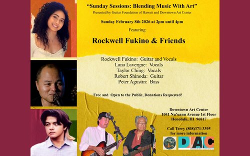 Sunday Sessions with Rockwell Fukino & Friends Sunday, February 8 from 2-4 p.m. in Studio 1C, FREE and open to the public. DAC and Guitar Festival of Hawaii, led by veteran music coordinator and musician Terry Oyama, team up to bring you a Sunday afternoon live music set by Rockwell Fukino (guitar and vocals), Lana Lavergne (vocals), Taylor Ching (vocals), Robert Shinoda (guitar), and Peter Agustin (bass). Donations encouraged!