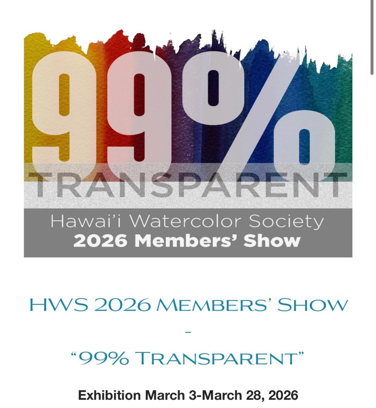 Honolulu (February 2026)—Downtown Art Center (DAC), at 1041 Nuʻuanu Ave., is pleased to host the Hawaiʻi Watercolor Society (HWS) 2026 Members’ Show, “99% Transparent,” on view March 3 through 28, in DAC’s second-floor Main Gallery. Admission is free and open to the public Tuesday through Sunday, 11 a.m. to 5 p.m.