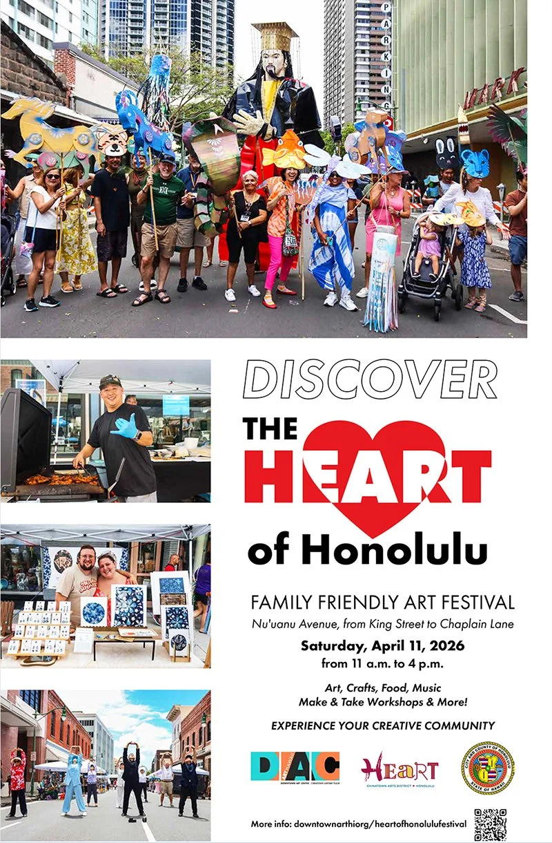 N ART CENTER PRESENTS THE 5TH ANNUAL HEART OF HONOLULU ART FESTIVAL, A FAMILY-FRIENDLY BLOCK PARTY IN CHINATOWN, ON SATURDAY, APRIL 11, 2026Honolulu (March 2026) –Downtown Art Center invites the community to celebrate Honolulu’s vibrant arts, culture, and food at the fifth annual HEART of Honolulu Street Festival in the Chinatown Arts District. This FREE, family-friendly, daytime event will transform Nuʻuanu Avenue—between King Street and Chaplain Lane—into a pedestrian-only block party showcasing local art, crafts, live music, food vendors, and interactive arts activities for all ages. The festival takes place on Saturday, April 11, 2026, from 11 a.m. to 4 p.m.