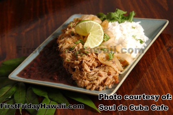 Lechon Asado (Cuban Roast Pork) ~ lean mojo marinated roast pork hand pulled and sautˇed with onions served with arroz moro and platanos maduros - Soul De Cuba Cafe Honolulu